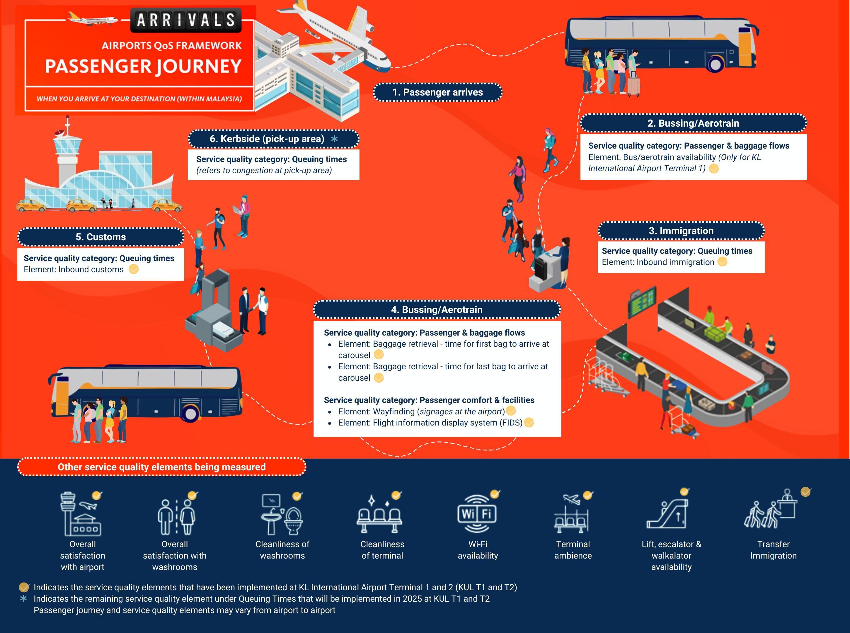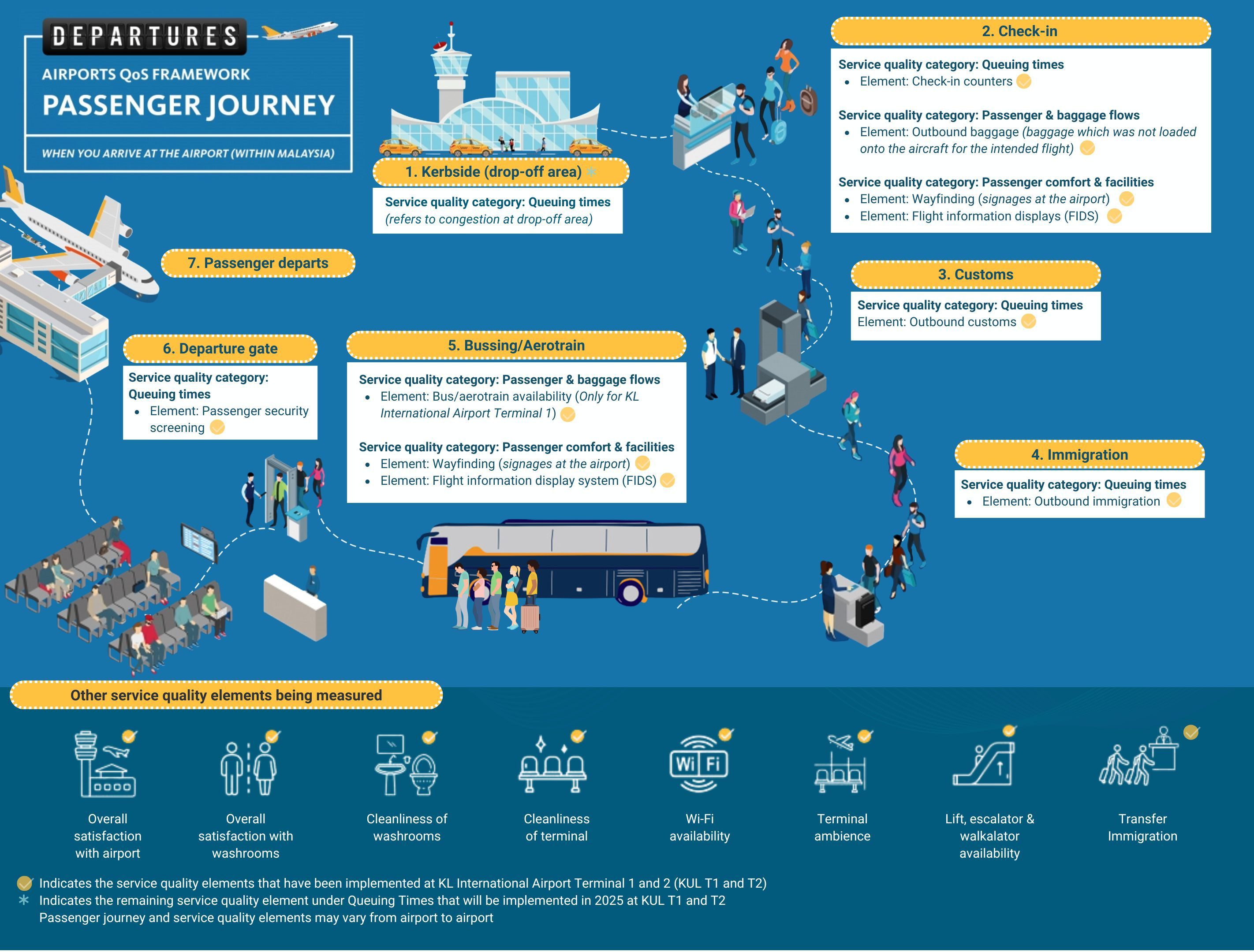 The diagrams below illustrates the passenger journey at the airport and the service quality elements involved at each stage under the Airports QoS Framework.