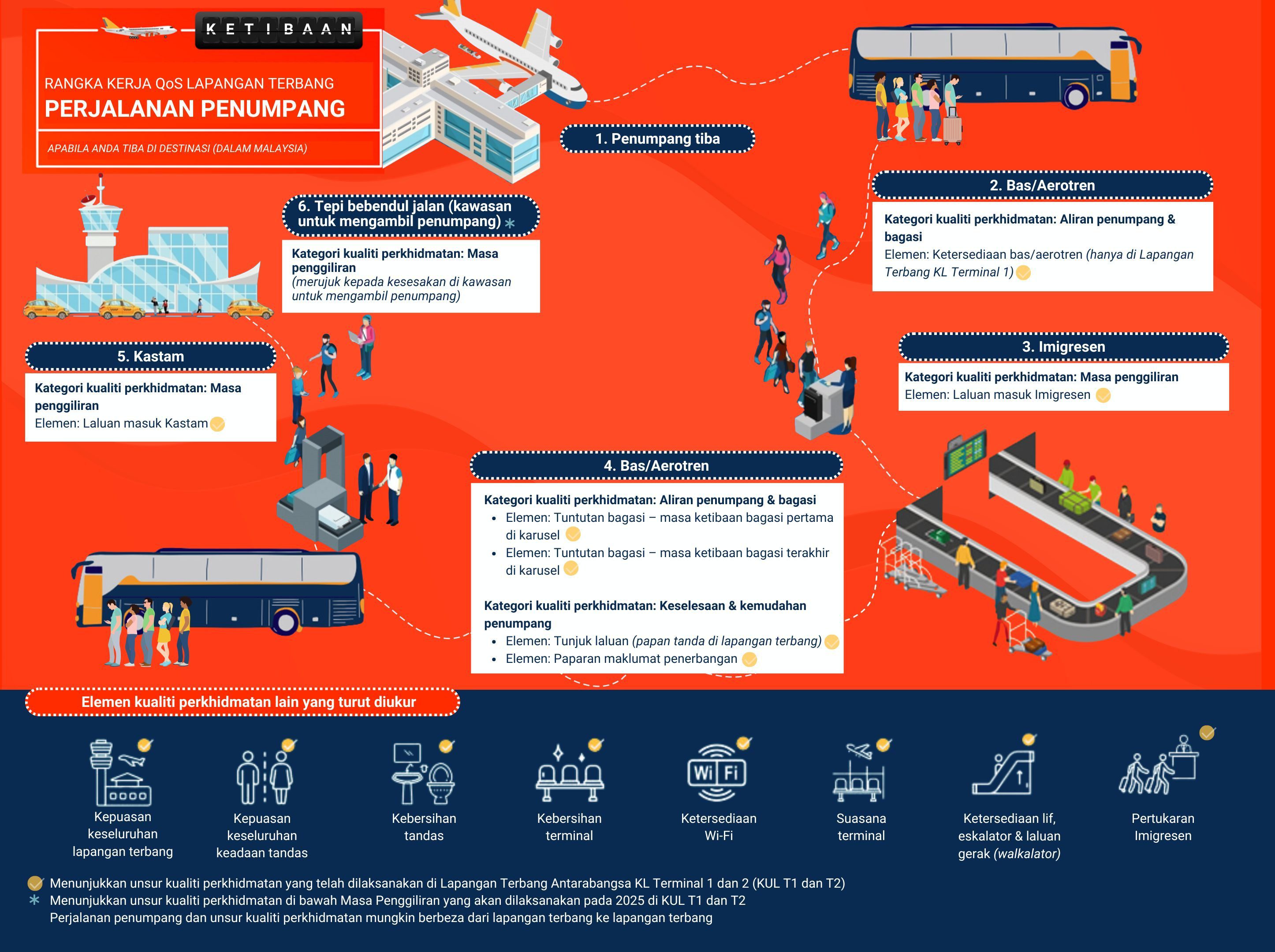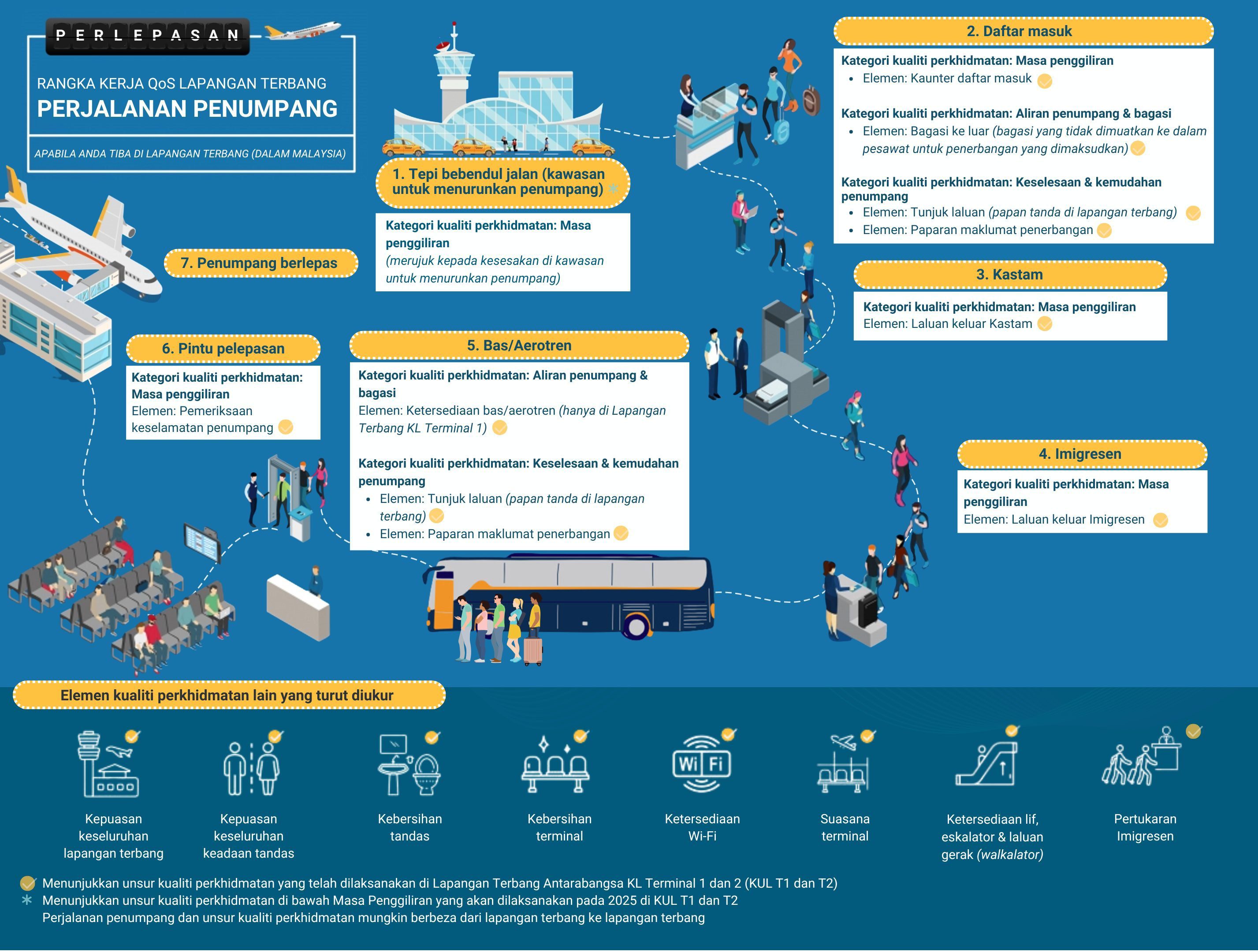 Rajah di bawah menunjukkan perjalanan penumpang di lapangan terbang dan elemen kualiti perkhidmatan yang terlibat pada setiap peringkat di bawah Rangka kerja QoS Lapangan Terbang.