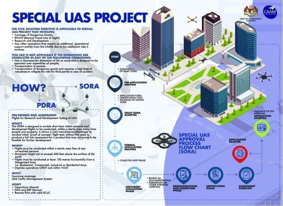 Pihak Berkuasa Penerbangan Awam Malaysia (CAAM) ingin menegaskan bahawa semua aktiviti penerbangan Sistem Kapal Udara Tanpa Pemandu (UAS) atau lebih dikenali sebagai dron adalah tertakluk kepada Peraturan-Peraturan Penerbangan Awam 2016 (MCAR 2016) Peraturan 140 – 144.