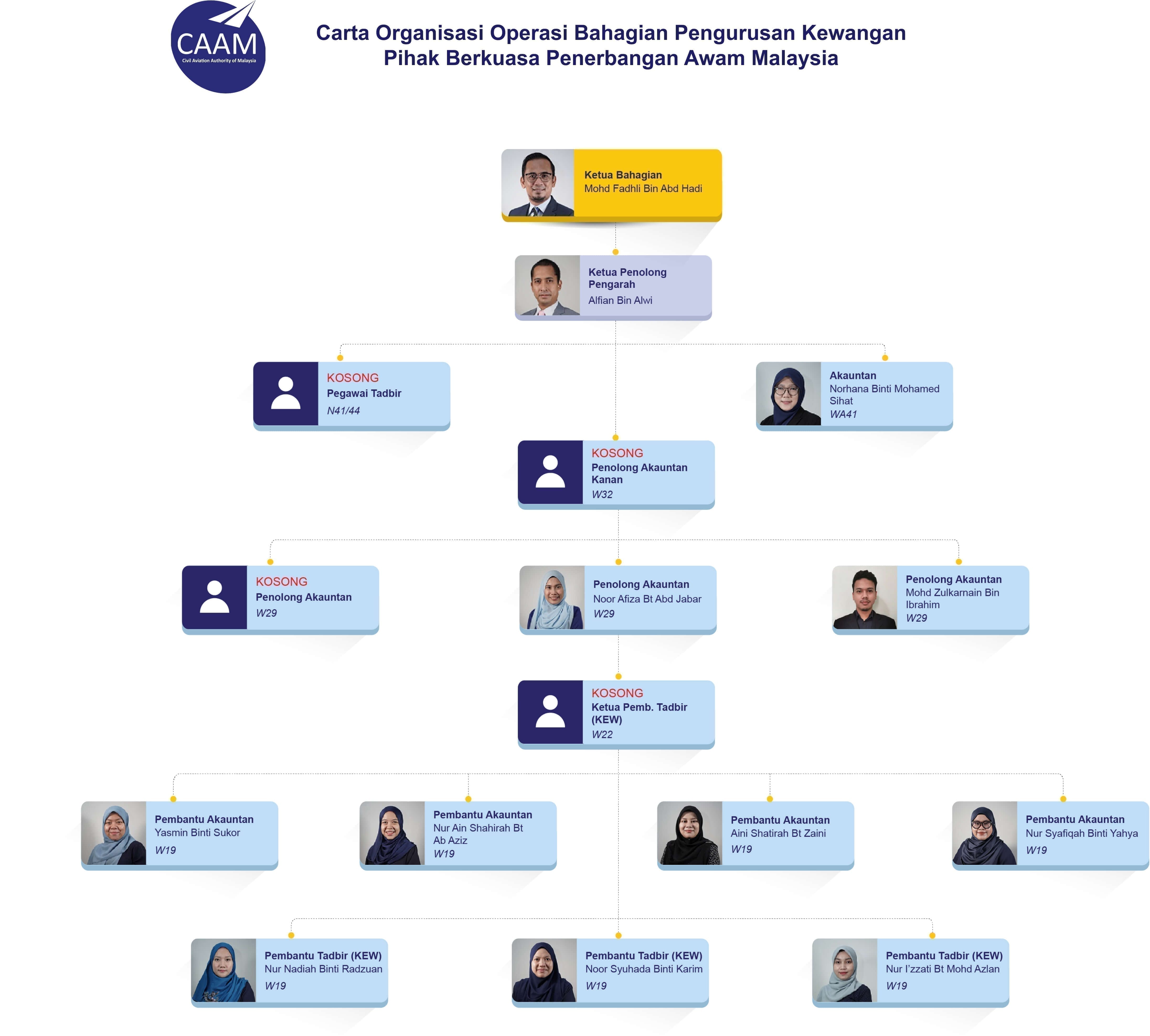 Melalui penstrukturan semula organisasi berdasarkan kepada Surat Kuasa Perjawatan Bil. K7/2019 bertarikh 8 April 2019, Seksyen Kewangan dan Akaun yang sebelum ini terletak di bawah Bahagian Khidmat Pengurusan, telah dinaik taraf sebagai sebuah Bahagian (Bahagian Pengurusan Kewangan) dengan fungsi utama untuk mengurus dan melaksanakan tugas melibatkan operasi kewangan dan perakaunan CAAM.